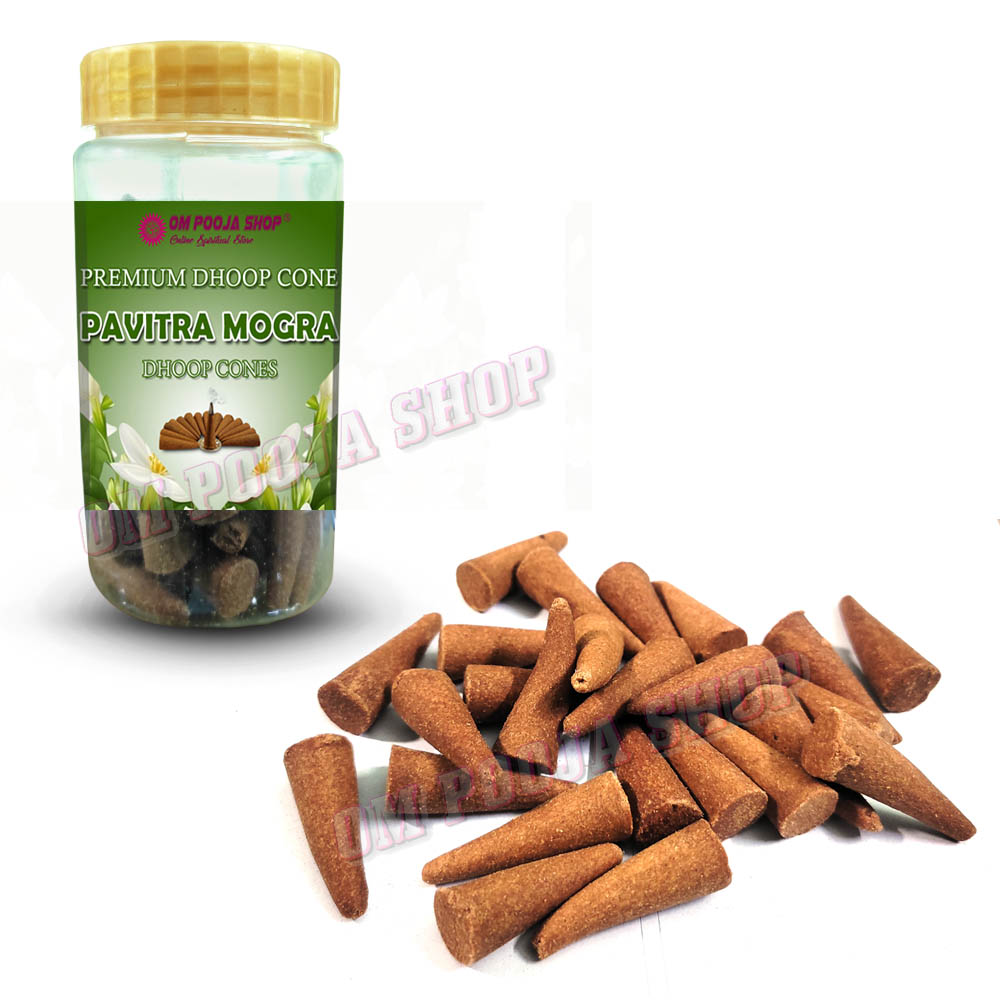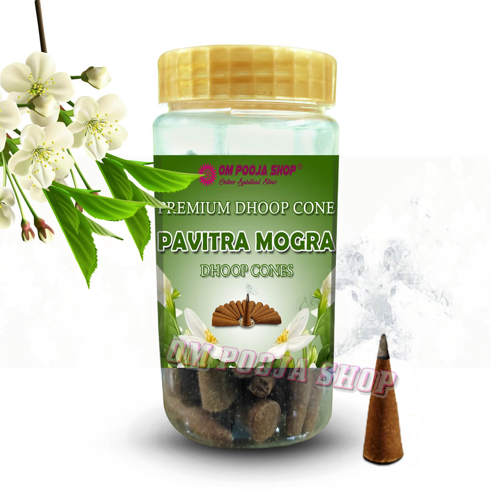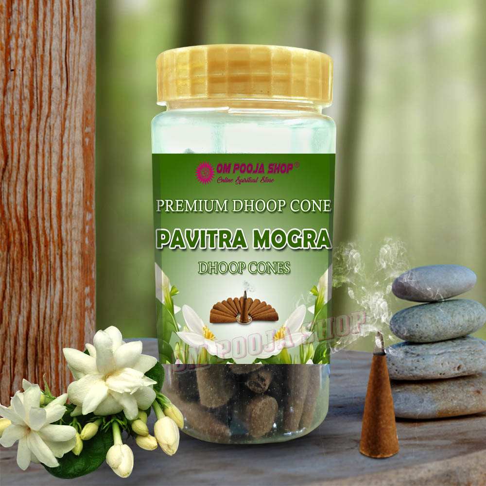 Pavitra Mogra Dhoop Cones are aromatic incense cones made using the essence of Mogra (also known as Jasmine), a sacred and fragrant flower often associated with purity, devotion, and tranquility. These cones are widely used in religious rituals, meditation, and spiritual practices.