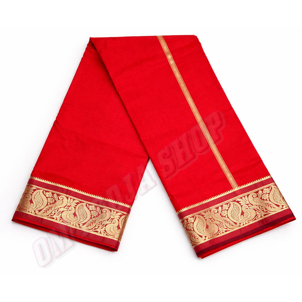 Divine Red Silk Dhoti-Angavastram with Peacock Zari Design