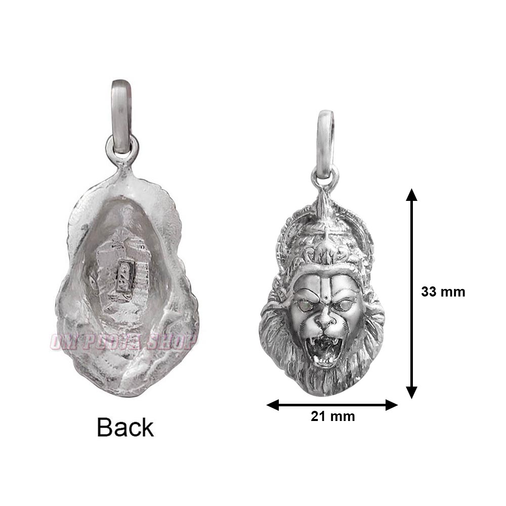 Face locket made of pure silver of Lord Shri Hanuman ji with American Diamond attached. Along with this, Shri Hanuman Yantra has been made in the back side. Wearing this Hanuman ji's pendant protects you from every evil power, as well as concentrates your mind. By wearing this locket, the grace of Lord Bajrangbali remains on you.Metal: 92.5 Pure Silver.Dimensions: 27mm (H) x 22mm (W) x 5 mm (thickness) approxWeight: 8.67 grams approxQuantity: 1 pcNote: It can be worn both men and women...