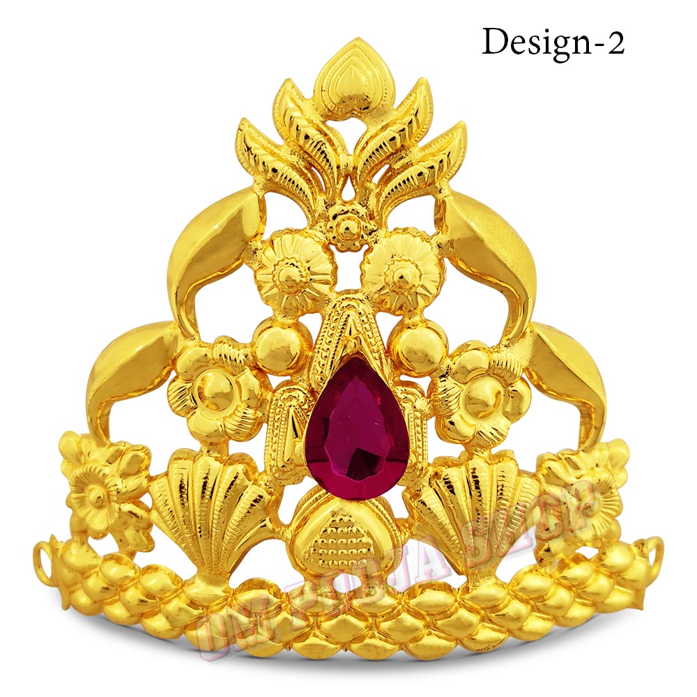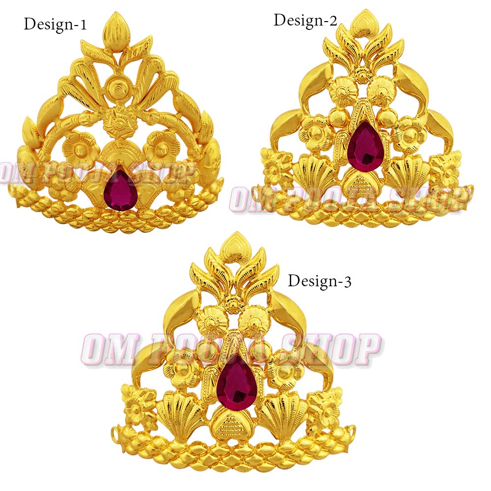 Golden Crown (Mutuk) is made of copper metal with gold polished along with red stone sudden on it. This crown also attached string for adjustment of the crown on the deity head. The concept of the crown originates from a cap, turban, or more formal metallic crown that was decorated with jewels.Material: Copper with gold platedDimensions: 3 inches (W) x 2.25 inches (H) x 3.75 inches (Circumference)Weight: 15 gramsQuantity: 1 pcNote: These products is handcrafted so design and color may sligh..