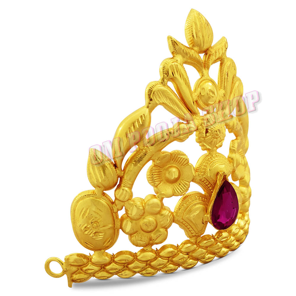 Divine Golden Mukut with Red Stone - Enhance the divine aura of your deity idol with this beautifully handcrafted Divine Golden Mukut with Red Stone. Designed in an intricate floral and traditional motif, this crown features a stunning red teardrop-shaped stone at the center, symbolizing devotion and spiritual radiance.