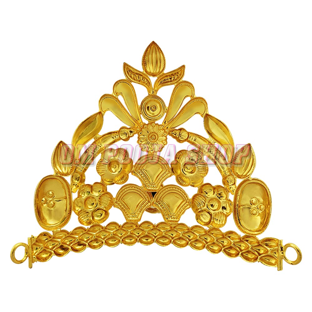 Golden Head Crown for God is made of copper metal with gold polished along with meenakari worked with holy Symbol. And also attached string for adjustment of the crown on the deity head. The concept of the crown originates from a cap, turban, or more formal metallic crown that was decorated with jewels.Dimensions: 3.5 inches (W) x 4.25 inches (H) approxQuantity: 1 pcNote: These products is handcrafted so design and color may slightly vary...