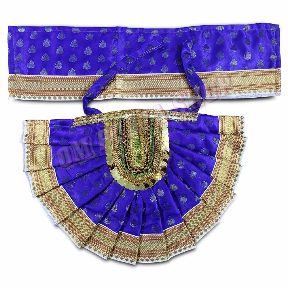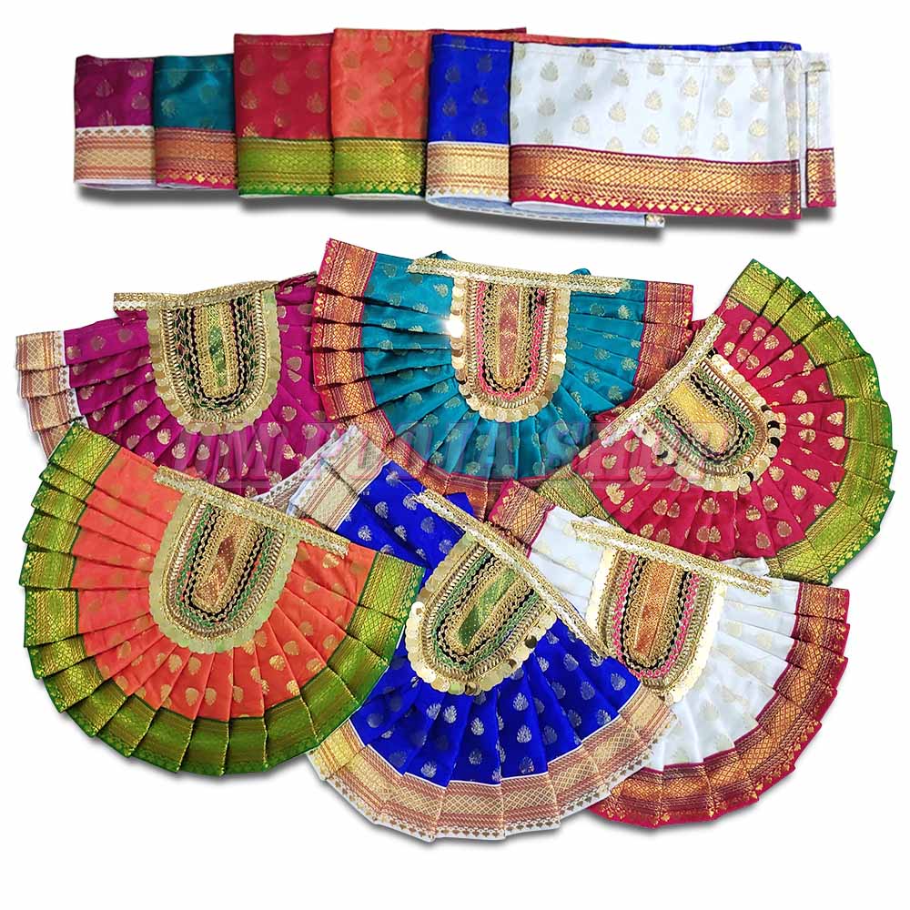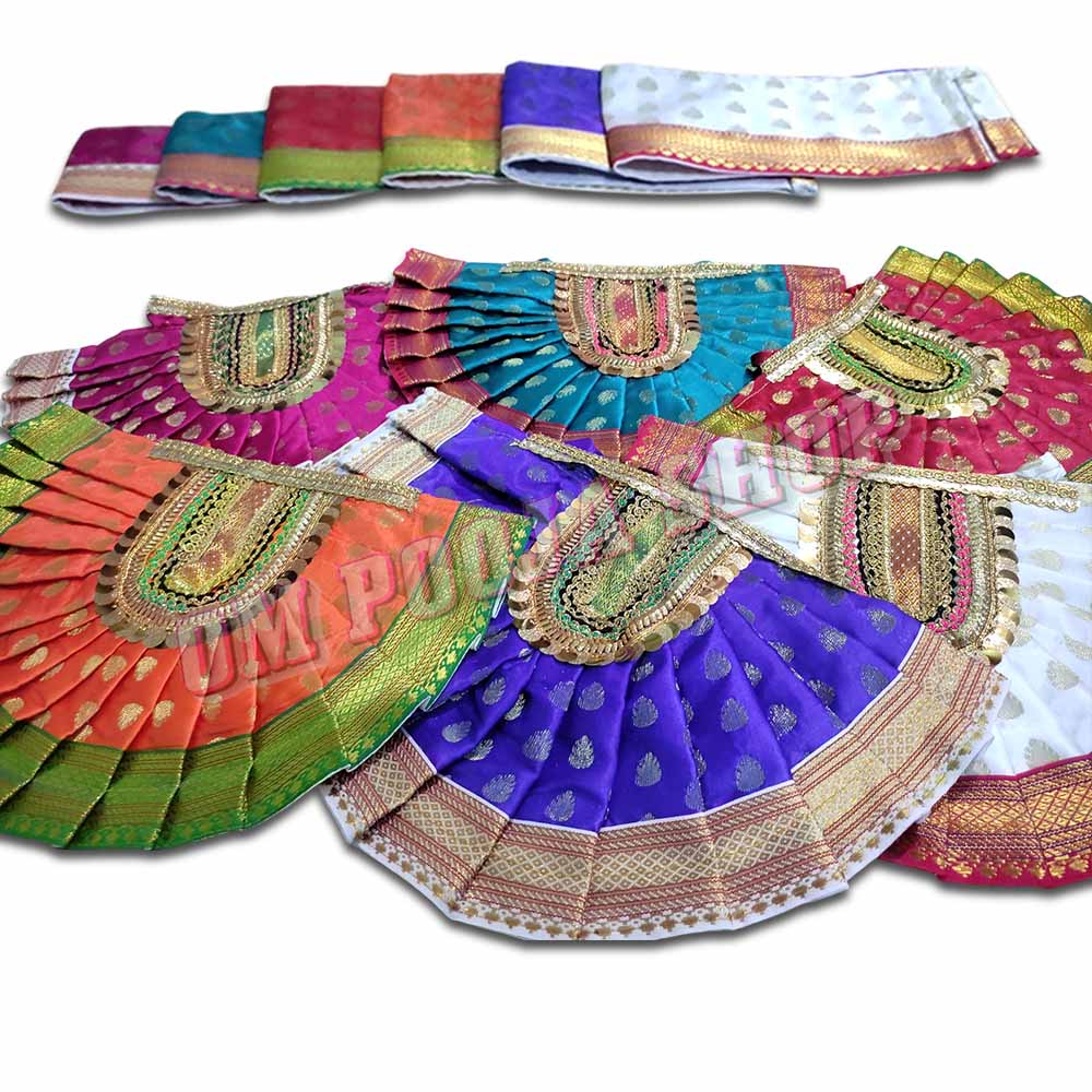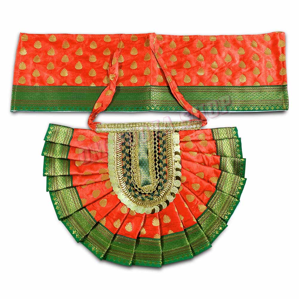 Traditional Lehenga Dupatta Choli for Divine Murti, it set made of silk cloth with golden boarder for decoration of Goddess murti / idols. A lehenga dupatta choli for a murti (divine idol) can be described as a traditional and beautifully crafted ensemble designed specifically for dressing up the murti.The lehenga dupatta choli for the murti is a three-piece outfit consisting of a lehenga (skirt), a dupatta (stole), and a choli (blouse). Each piece is intricately designed with attention to detai..