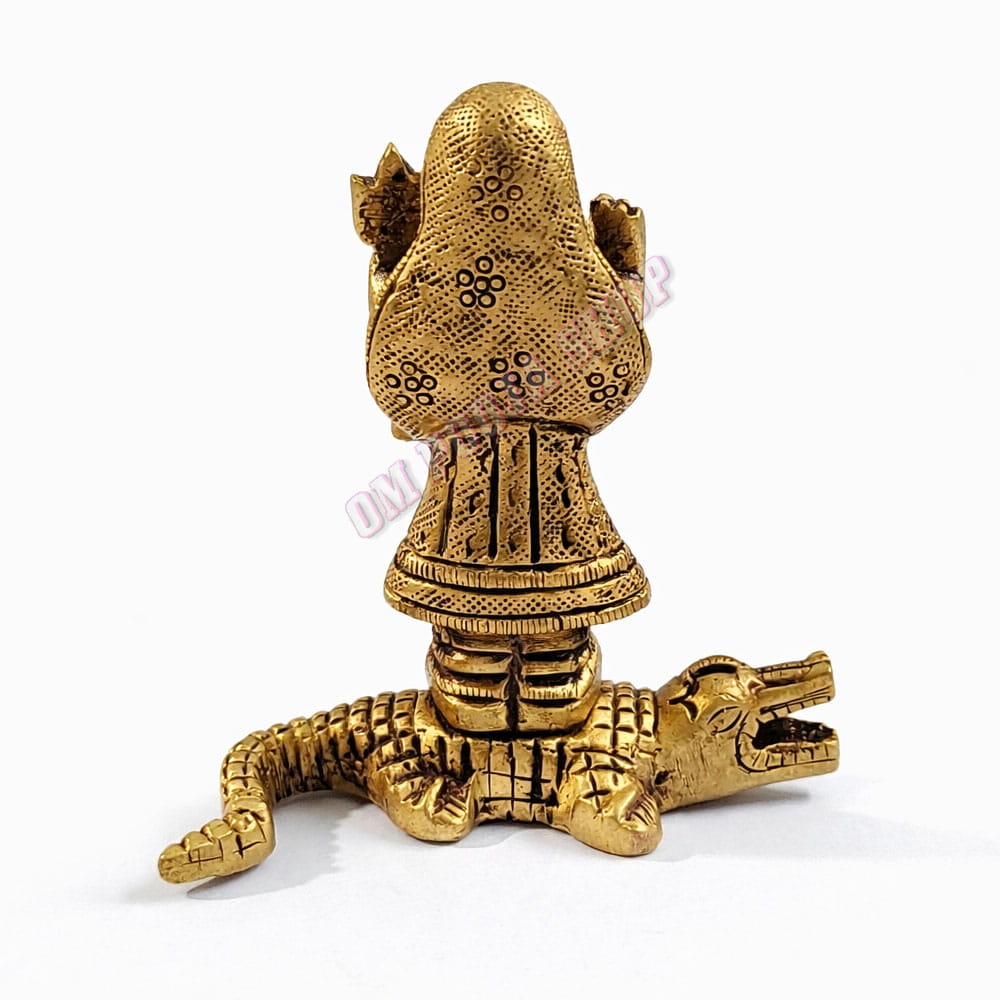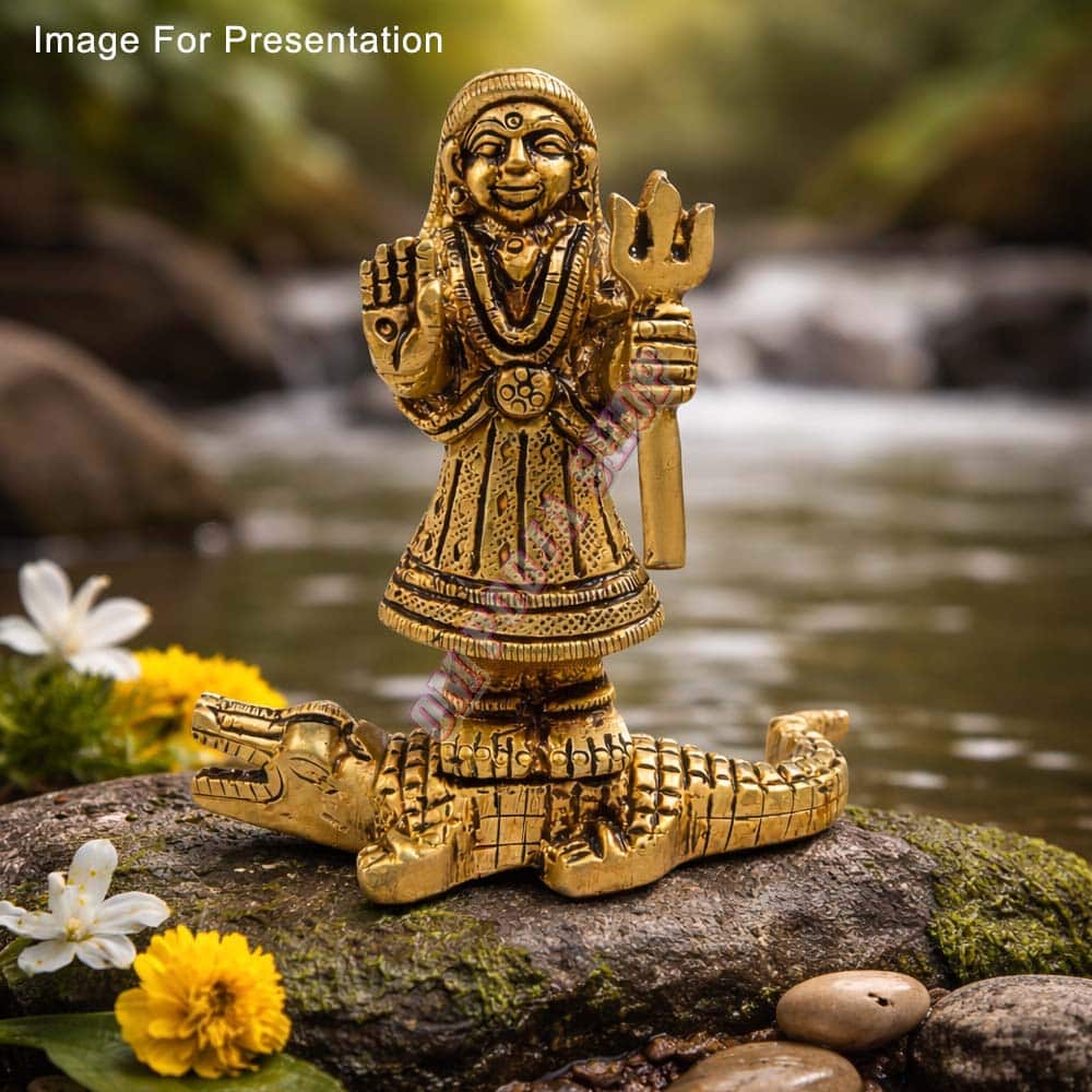 A Khodiyar Mata brass idol typically depicts the Hindu goddess Khodiyar Mata, revered as a deity of power, protection, and prosperity, especially by the communities in Gujarat, India. Brass idols of Khodiyar Mata are often crafted with intricate detailing to capture the goddess's serene expression, adorned with traditional jewelry, and sometimes accompanied by her symbolic crocodile mount, which signifies her connection with water.