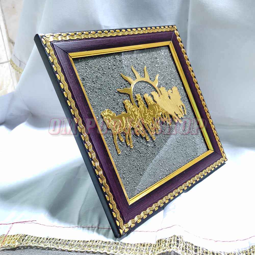 The sparkling pyrite backdrop enhances the spiritual aura while adding a luxurious touch to your décor. The rich wooden frame with golden detailing makes it a perfect centerpiece for living rooms, offices, pooja rooms, and gifting on auspicious occasions.