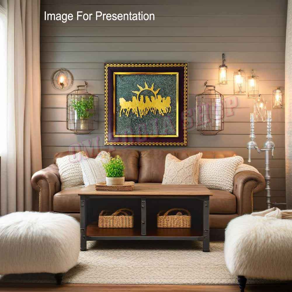 Bring divine positivity and radiant energy into your home with this Surya Dev Seven Horses Pyrite Wall Frame. Beautifully crafted with a shimmering pyrite background, this elegant frame features a golden silhouette of Surya Dev riding the majestic seven horses, symbolizing success, strength, and new beginnings.