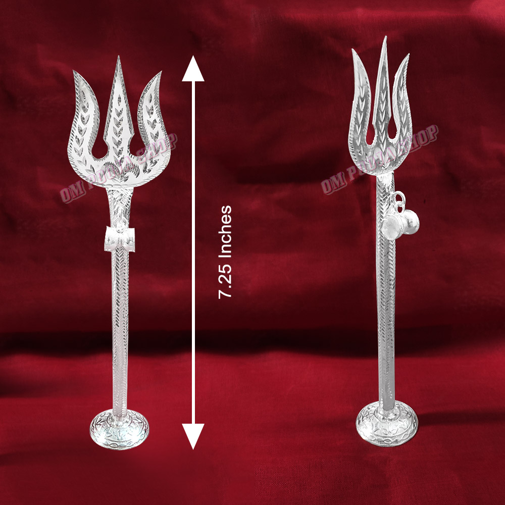 Lord Shiva Trishul Trident Made of pure silver, this trident is dedicated to Lord Shiva. It comes with a trident stand, which allows it to be kept anywhere in its standing position. Damru is also attached to this trident. You can keep a silver trident (chandi ke trishul) in your worship house or temple.