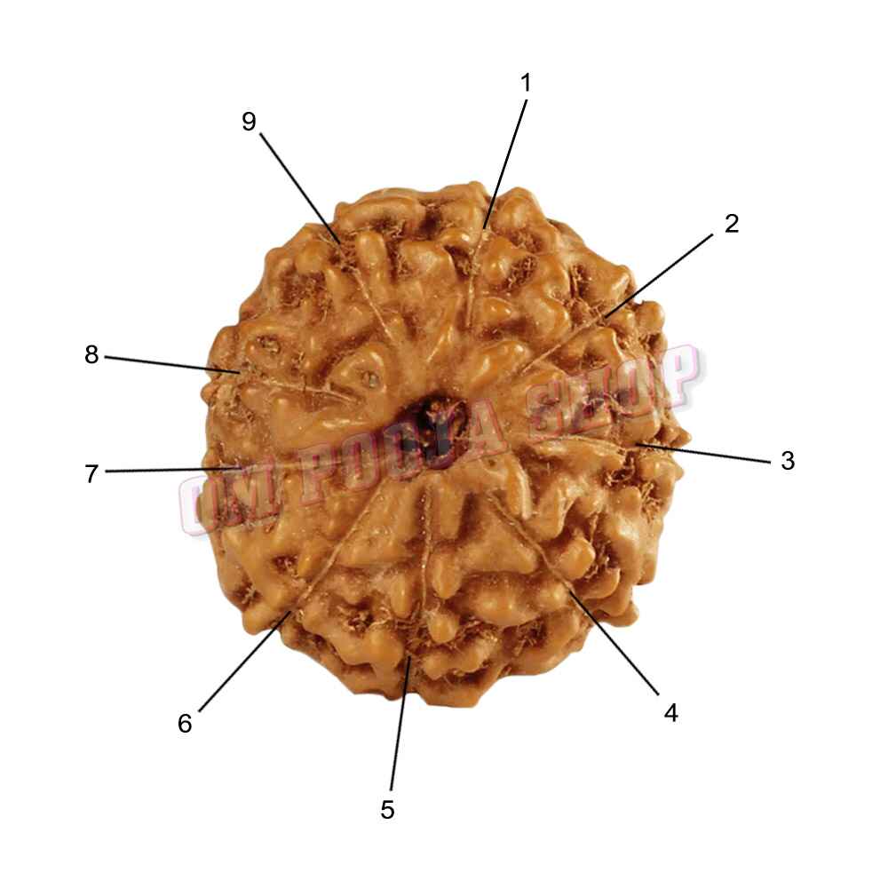 - Appearance: This Rudraksha bead has nine natural vertical lines, or "mukhis," running from top to bottom on its surface.