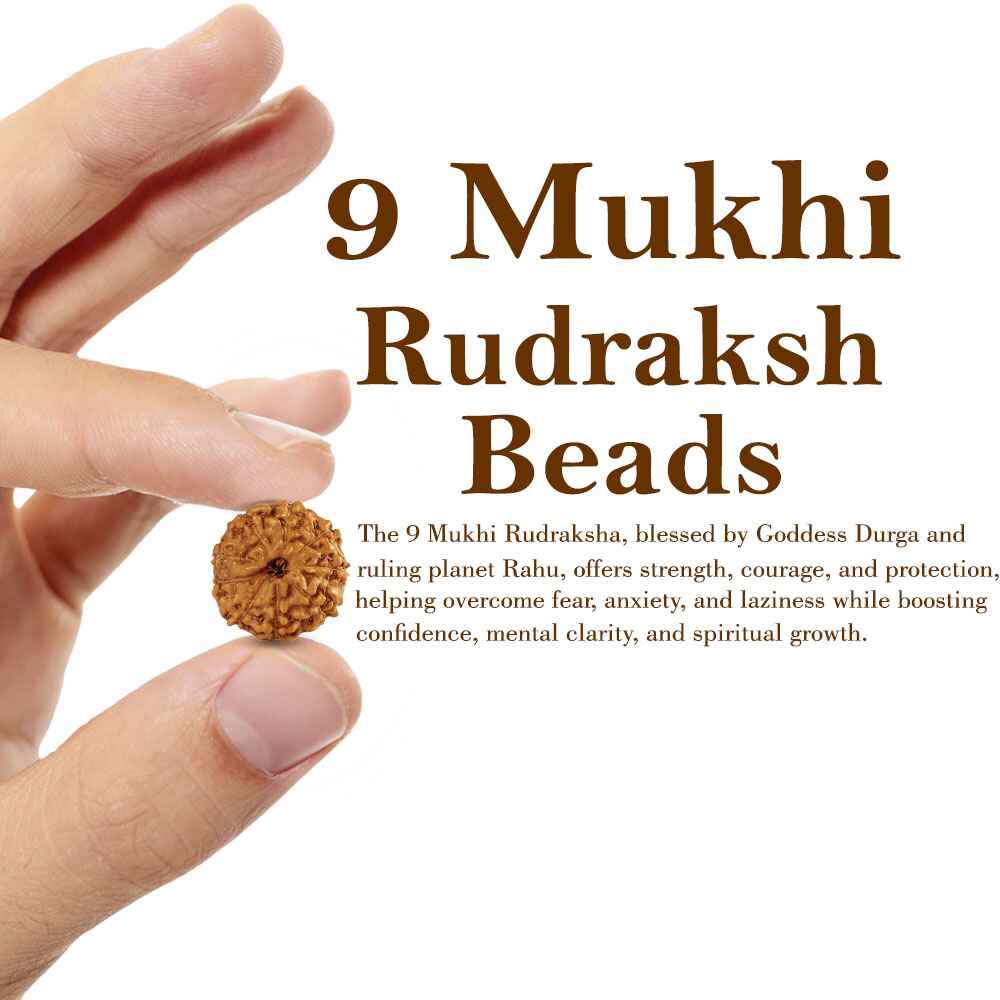 Wearing a Nine Mukhi Rudraksha is believed to enhance confidence, awaken inner Shakti, and provide spiritual protection from negative energies and evil influences. It supports spiritual growth, meditation, and emotional balance, especially for those seeking fearlessness and mental clarity.