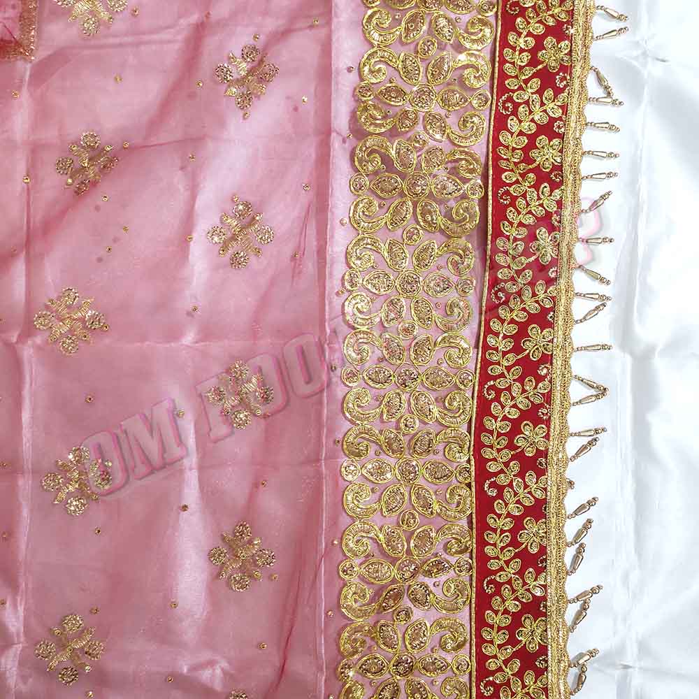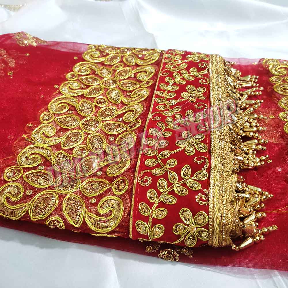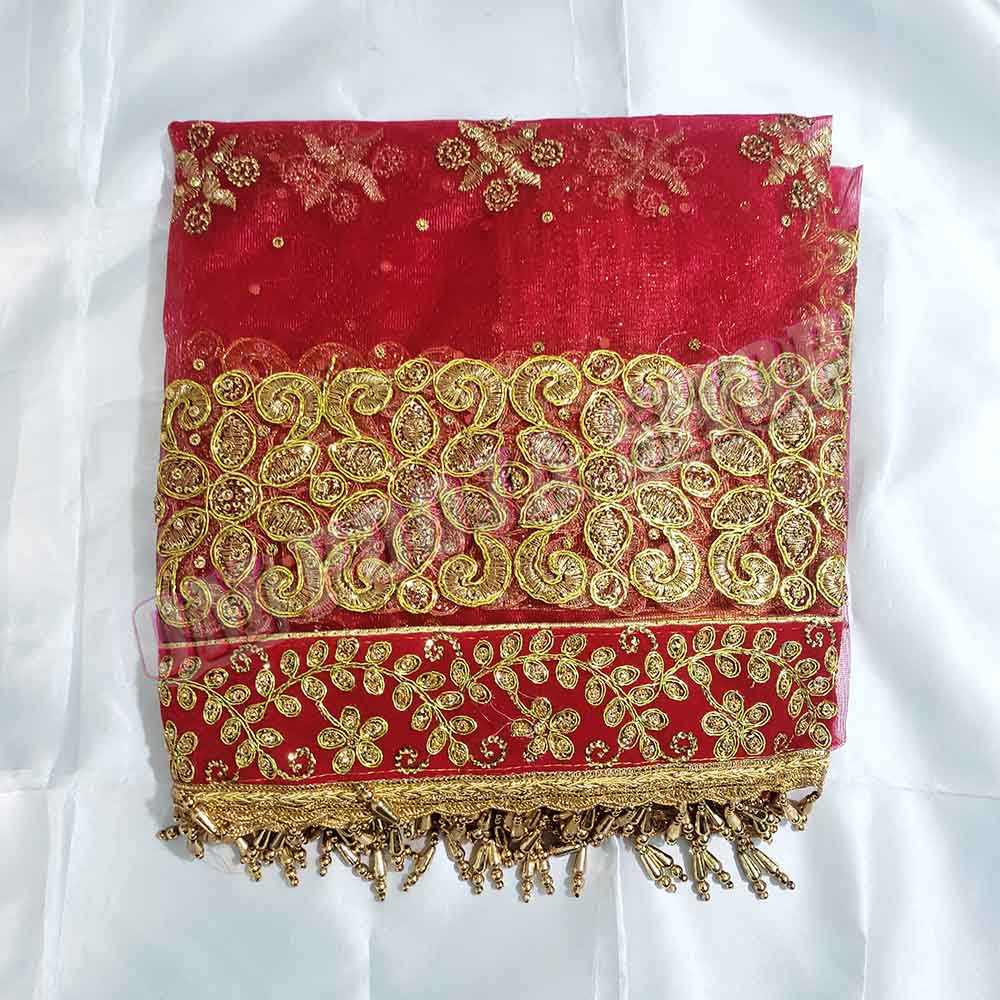 Bridal Embroidery Chunri is made of soft Netted Cloth with Fancy border along with hand Embroidery worked on it. This Chunni or Chunri can use in wedding ceremonies and offering to the Goddess Idols.Chunri is an integral part of festivities. It is draped on head and shoulders like a scarf by women during religious functions, ceremonies and prayer rituals. It is draped around deity Idols and altars and thus made from auspicious colors. Often a chunri is used in altar as a seat for Idol..