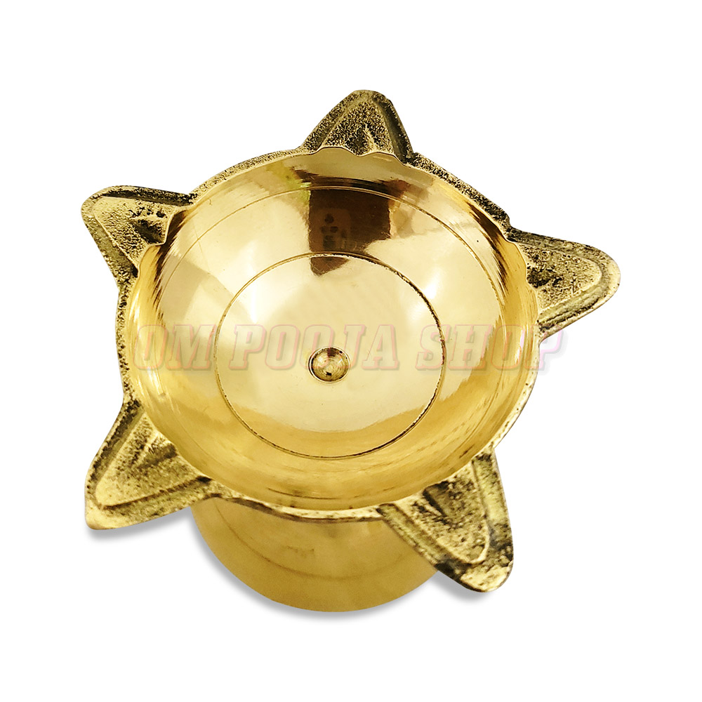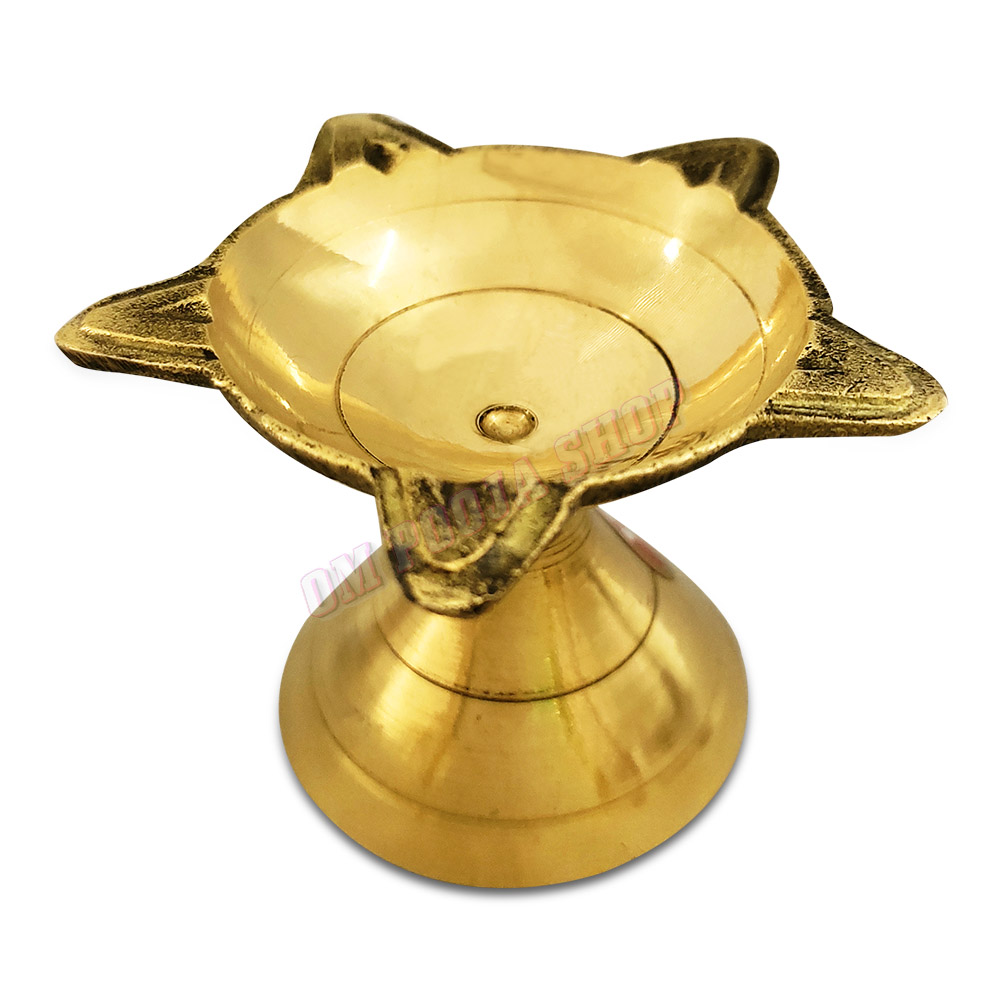 Beautifully crafted brass Cup Shaped diya or oil lamp deepam. The light symbolizes knowledge, positivity and tranquility, and lighting diyas or earthen lamps on daily basis is considered highly auspicious. It is said that regular lighting of diyas removes darkness, ignorance and evil.Since the light of a ghee lamp is believed to bring in prosperity, knowledge and wisdom, it is a customary rule in India to start all the auspicious religious events or social functions by lighting the lamp. By doin..