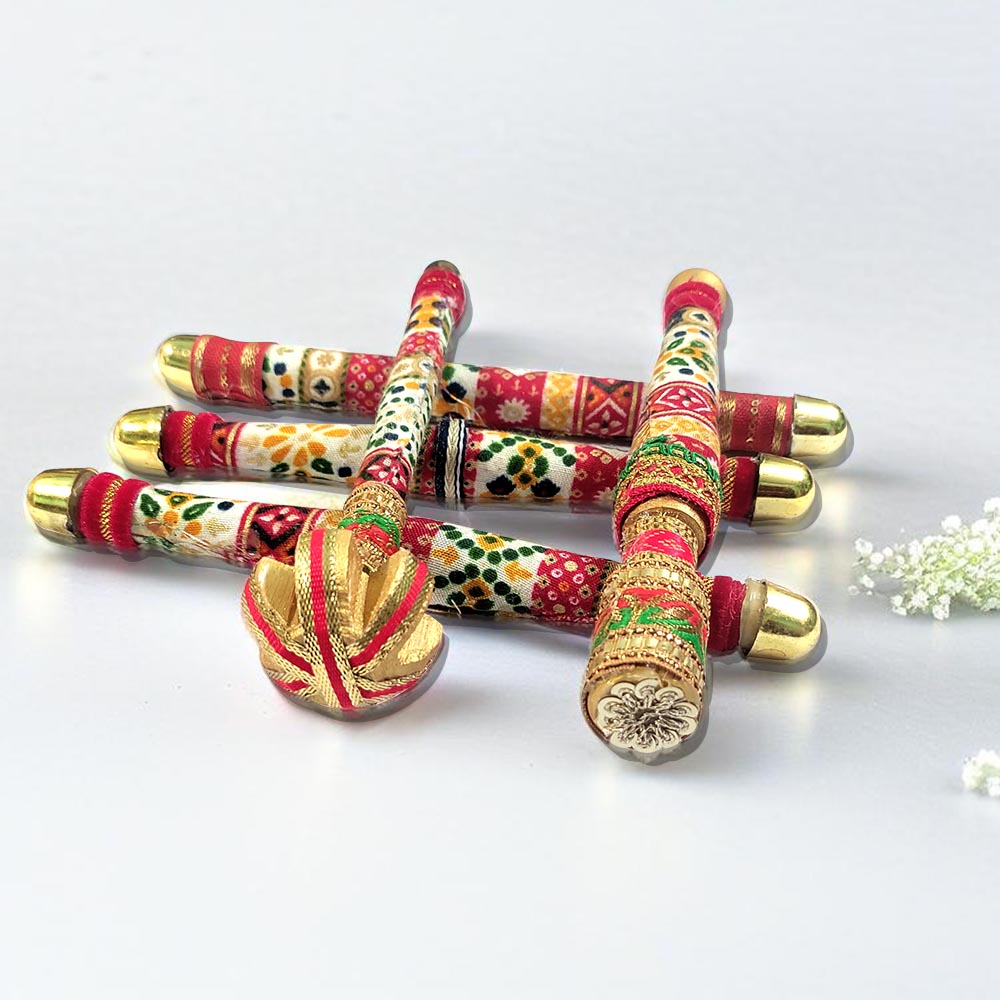Traditional Handcrafted Gujarati Marriage Pokhana / Pokhna is used in marriage ceremonies, it is used to perform aarti and eyesight of the Bride and Groom. This Pokhna set made of wooden with decorate as Indian traditional style.Dimensions of each: 6.5 inches (H) x 1.25 inch (W) approxWeight: 120 grams approxQuantity: 1 pcNote: These products is handcrafted so design and color may slightly vary...