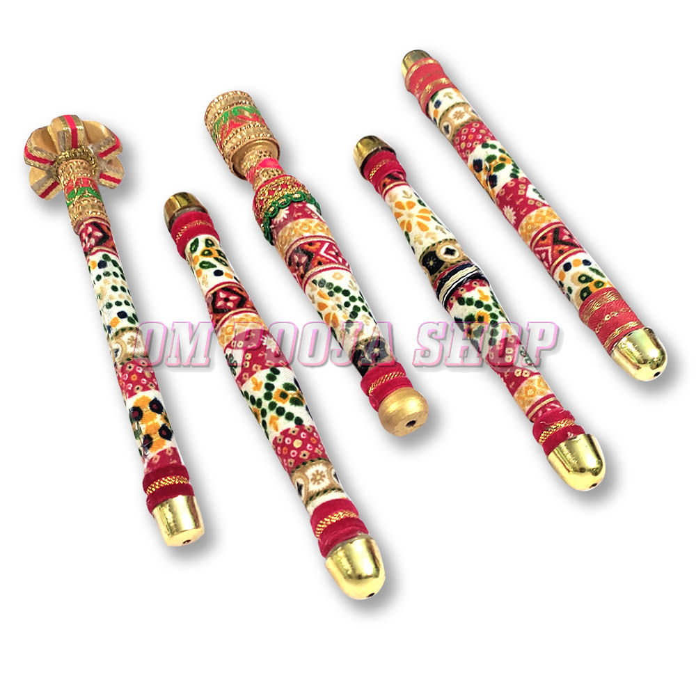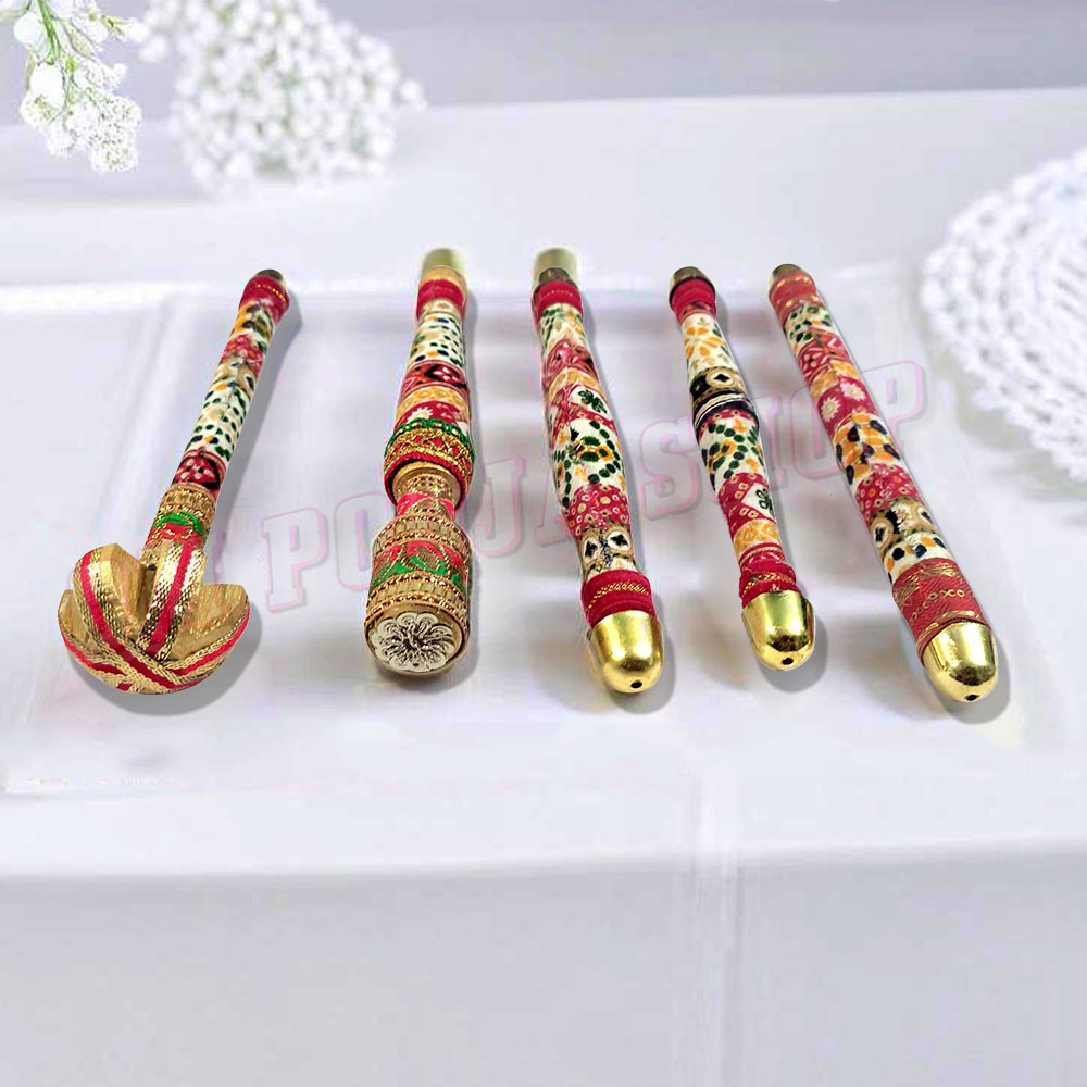 Pokhana is used in marriage ceremonies, it is used to perform aarti and eyesight of the Bride and Groom. This Pokhna set made of wooden with decorate as Indian traditional style.Dimensions of each: 6.5 inches (H) x 1.25 inch (W) approxWeight: 100 grams approxQuantity: 1 pcNote: These products is handcrafted so design and color may slightly vary...
