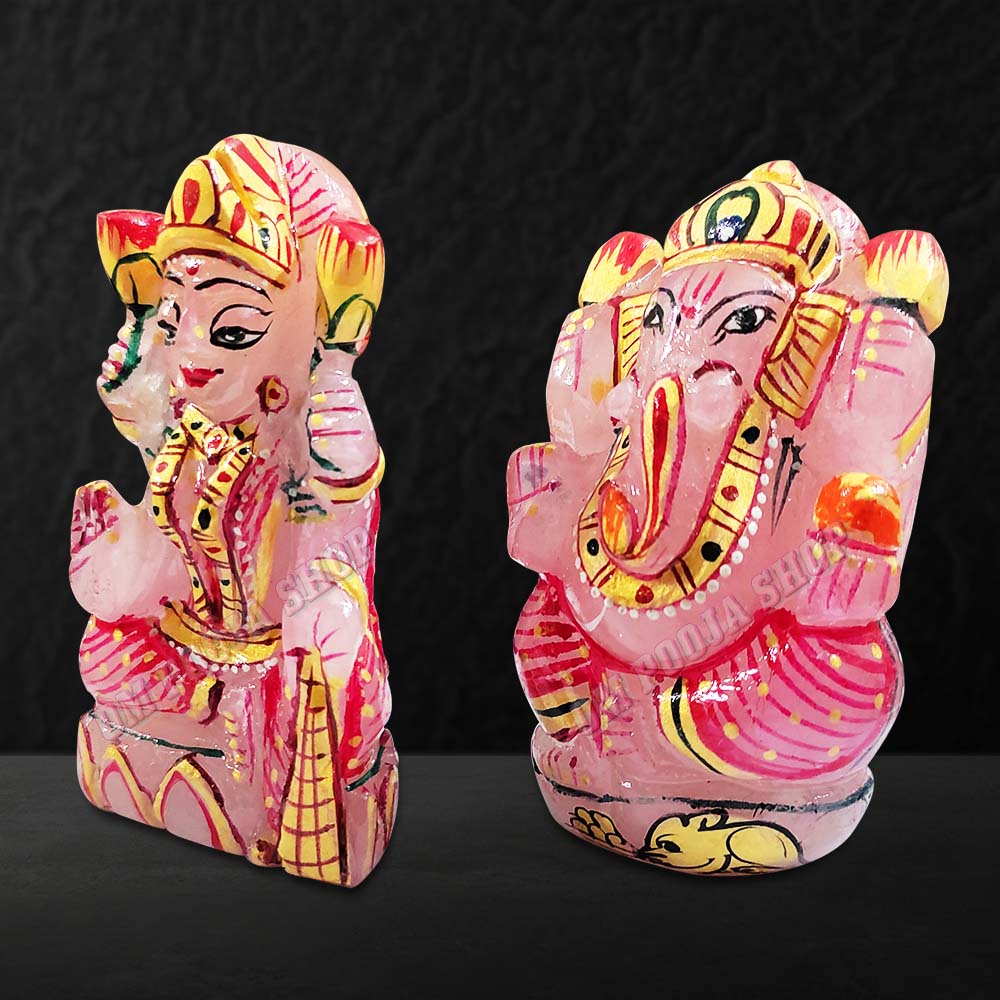 Beautiful Handcrafted Goddess Lakshmi Mata and Lord Ganesha Murti is made in Natural Rose Quartz Gemstone with beautifully decorated with color. Lord Ganesha represents Joy and happiness which is symbolic to bring Prosperity and Good Luck. And Goddess Lakshmi Mata is called the goddess of wealth.