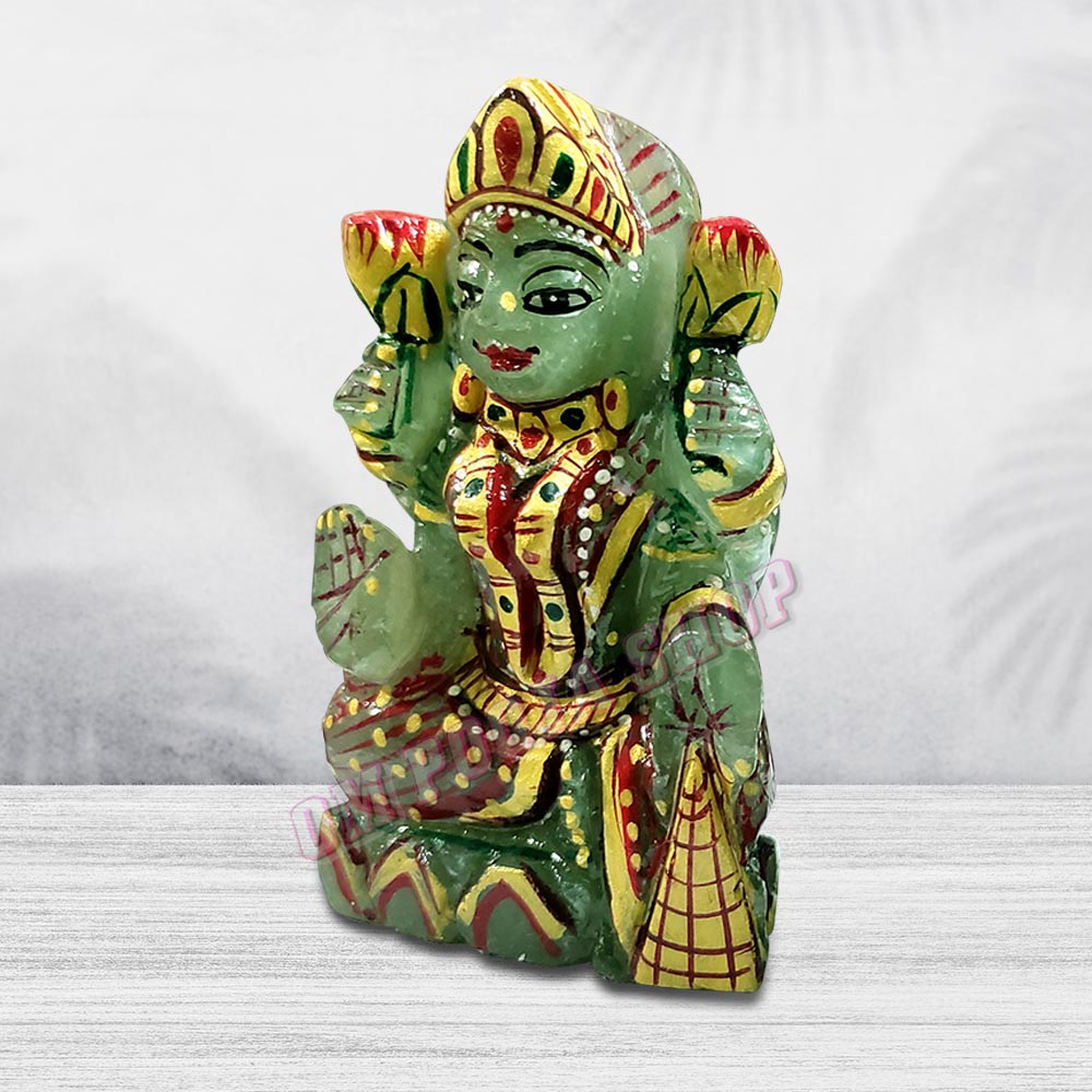 This hand made idol of smiling Mata Mahalakshmi is made in green jade stone. The specialty of this idol is that it is made of emerald, that is, it represents the planet Mercury. Any person who has weak Mercury in his horoscope, worshiping this idol will fulfill all his wishes and all that work will be fine, along with the grace of Mother Mahalakshmi will always remain. Mahalakshmi is the goddess of wealth. Worshiping her brings wealth, food, glory, respect and all spiritual and material pleasure..