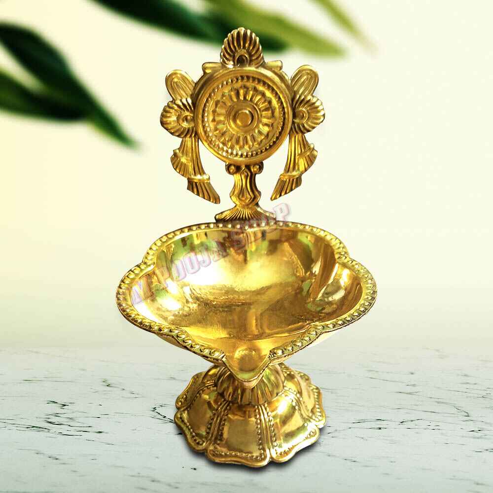 Bring divine elegance and spiritual energy to your prayer space with the Sacred Chakra Design Brass Diya, beautifully crafted for daily pooja and festive rituals. Featuring a traditional chakra motif back plate, this diya symbolizes protection, balance, and positive energy, making it an ideal addition to any home temple.