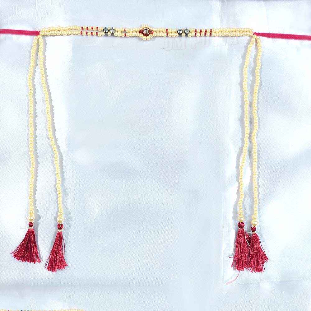 This Mundavalya Jewellery for Maharashtrian Bridal & Groom is made of white and golden pearl. The very common thing among bride & groom on their wedding is Mundavalya. Mundavalya is a forehead ornament worn by Maharashtrian bride & groom. It is made from pearl & has two pearls strings which define the togetherness of bride & groom. It is horizontally tied on the forehead & it has great importance in Maharashtrian wedding.The marriage function starts with Gauriha..